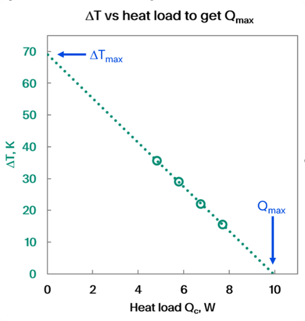 To measure Qmax, we mount the TEM on a heat exchanger at a controlled Th temperature and begin by measuring ∆Tmax. We do that because we need to know Imax. Next, we apply a constant current Imax to the TEM. We then increase the heat load Qc while measuring ∆T. Low heat loads will give larger ∆T values and vice versa; the measured values are shown as green circles in the plot. We calculate the Qc that would create ∆T=0, and that value is Qmax.