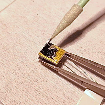 The photo to the right shows liquid metal being applied to the bottom of a TEM. Unfortunately, liquid metal cannot be used on the cold side of a TEM, because the cold side will reach temperatures far below the freezing point of any liquid metal alloy.