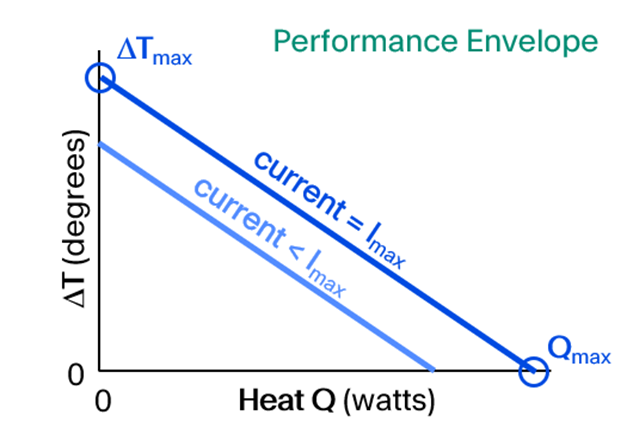 The performance of a TEM under a heat load is similar to the way a fan or a water pump responds: if you ask for more flow, you get less pressure. In a TEM, the relationship between ∆T and Qc is linear, as seen in the previous section "Heat pumping and how to measure it". The line between ∆Tmax and Qmax is what the TEM provides when it is powered by a current equal to Imax. On that line, the efficiency is poor, because the TEM is working as hard as it can.