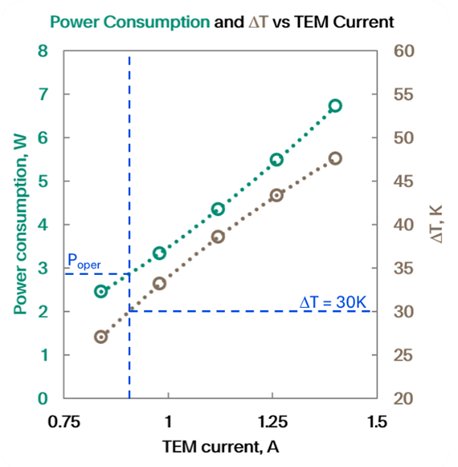 At the same time, we measured the TEM voltage and combined it with the TEM current to get power consumption (green circles, corresponding to the left Y axis).