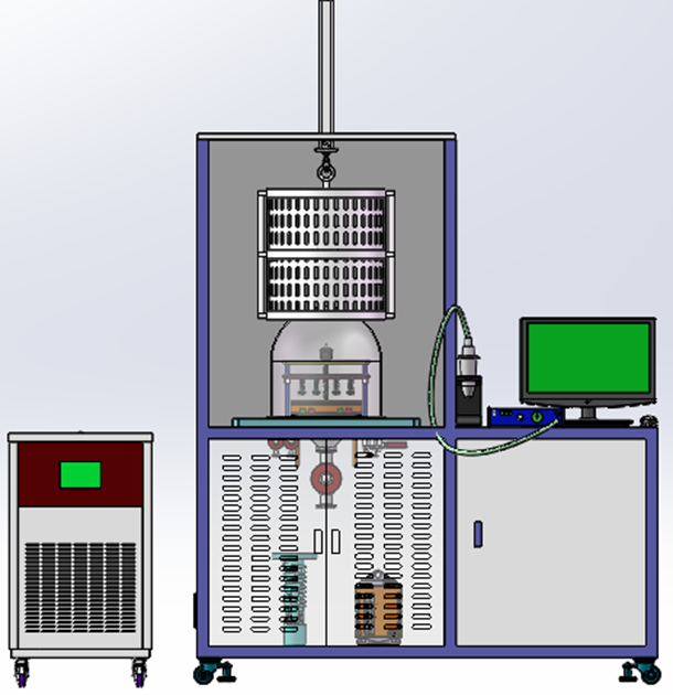 The rendering to the right illustrates a typical test system’s component: bell jar with lift, water chiller, vacuum pumps, and computer system with power supplies.